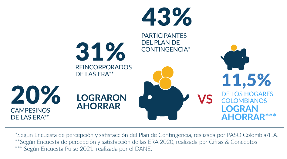 En el caso de las Escuelas Rurales Alternativas (ERA) la tasa de ahorro de los reincorporados ha aumentado (el 31% ha podido ahorrar en 2020 frente al 29% de 2019 y el 23% de 2018). Dicho aumento se produjo incluso durante la pandemia por Covid-19. Para los campesinos participantes en las ERA, la tasa de capacidad de ahorro aumentó del 5% en 2018 al 20% en 2020. Por otra parte, como resultado de la implementación del Plan de Contingencia, el 43% de las participantes afirmaron que lograron ahorrar algo de dinero. En comparación con los datos del resto del país, estas cifras contrastan con el resultado de la Encuesta Pulso 2021, realizada por el Departamento Administrativo Nacional de Estadística (DANE), según la cual apenas el 11,5% de las personas tienen capacidad de ahorro en Colombia1.