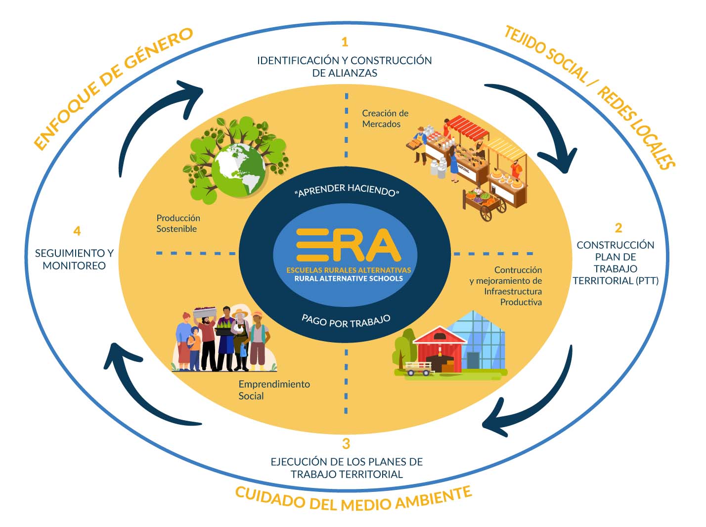 Las Escuelas Rurales Alternativas (ERA) funcionan como aulas vivas en el trabajo cotidiano con los participantes. En lugar de un pensum predefinido el conocimiento se articula alrededor del acompañamiento técnico permanente a los proyectos productivos que se desarrollan en cada territorio, profundizando los conocimientos requeridos para la sostenibilidad de cada proyecto en específico. Este acompañamiento técnico está orientado a promover una óptima organización de las fincas, el aprovechamiento de residuos, desechos y subproductos, la fabricación y utilización de abonos y alimentos para animales con materias primas locales, la semiestabulación para complementar la alimentación de algunos animales, la adopción de nuevas tecnologías y de prácticas ambientalmente sostenibles, la incursión en procesos de transformación de materias primas, la creación de huertas caseras o comunitarias para la seguridad alimentaria, entre otras actividades. Este acompañamiento incluye también la cualificación y creación de redes de comercialización, tema que será tratado a profundidad en una siguiente entrega de Nuestro Impacto en Datos.