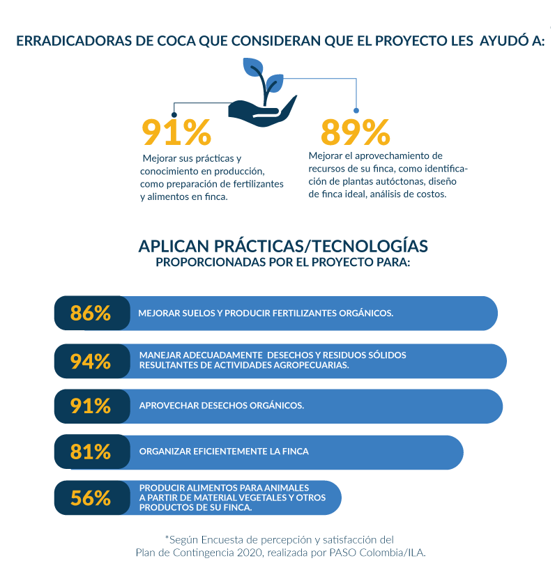 Con este enfoque pedagógico y productivo desarrollado mediante la metodología aprender haciendo el 77% de los participantes califican la asistencia técnica recibida en las ERA como buena o excelente. Este mismo enfoque fue usado en el caso del Plan de Contingencia en Apoyo a Familias Erradicadoras de Coca, financiado por el Fondo Multidonante de las Naciones Unidas para el Sostenimiento de la Paz en Colombia y diseñado e implementado por PASO Colombia en coordinación con la Consejería Presidencial para la Estabilización y la Consolidación. El 86% de los participantes en este proyecto manifestaron que continuarán con las prácticas aprendidas para el mejoramiento de suelos y la producción de fertilizantes orgánicos, el 91% seguirá implementando los métodos aprendidos para el aprovechamiento de los desechos orgánicos y el 56% producirá alimentos para sus animales a partir de material vegetal y otros productos de su finca gracias a lo aprendido en el proyecto.