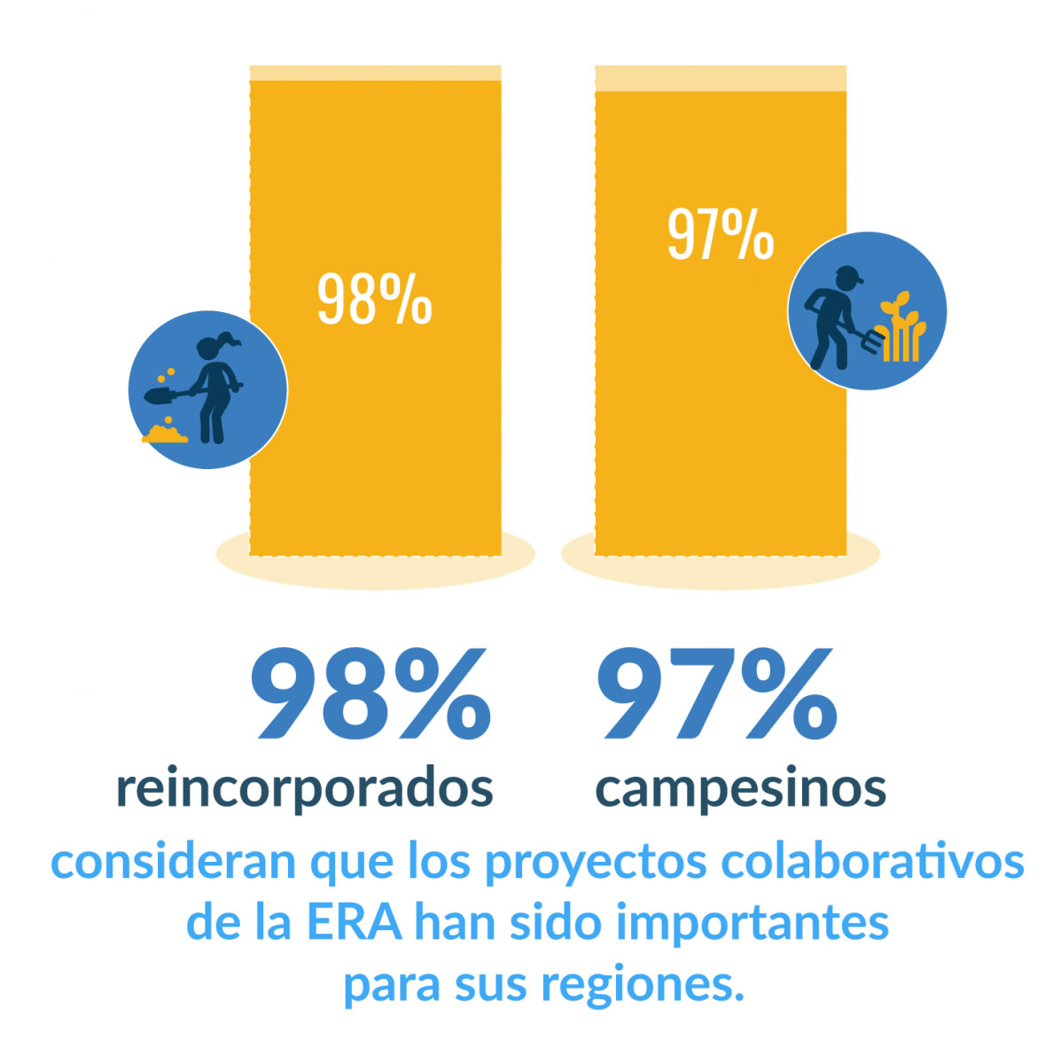 La experiencia de trabajo nos ha permitido confirmar que la interrelación entre los ejes económicos, productivos y sociales ofrecen a los socios participantes resultados integrales para sus proyectos productivos y su calidad de vida. Un tejido social fortalecido participa de economías legales más dinámicas, lo que a su vez posibilita que en los territorios rurales afectados históricamente por el conflicto armado haya mejores expectativas sobre el futuro y su prosperidad. Nos complace mucho saber que a nivel nacional el 89% de los reincorporados participantes en las ERA respondieron que tenían planes de continuar trabajando colaborativamente con las comunidades. Así mismo, 70% de los miembros de la comunidad planea continuar trabajando en proyectos asociativos con reincorporados. Esto muestra que el trabajo colaborativo ha demostrado ser para ellos un medio efectivo para mejorar su calidad de vida.