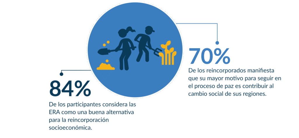 En este contexto las ERA se han consolidado como plataformas de integración de actores mediante diálogos, trabajo colaborativo diario y objetivos priorizados a largo plazo mediante procesos de concertación colectiva. En su conjunto, las ERA han propiciado la creación de lazos comunitarios entre sus participantes: el 76% de los miembros de la comunidad sienten que su relación con los reincorporados ha sido positiva o muy positiva, el 83% de los campesinos se siente cómodo teniendo un reincorporado como vecino y un 70% reporta que es parte de algún proyecto productivo con reincorporados.