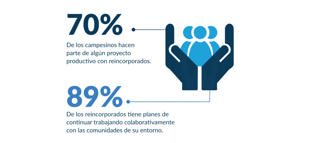 En las comunidades que han surgido gracias a los espacios de las ERA, la reincorporación social se traduce en la reducción de las estigmatizaciones, divisiones y otros obstáculos para la integración entre los diferentes actores. El 89% de los reincorporados indica que tiene planes de continuar trabajando colaborativamente con las comunidades de su entorno y el 91% de ellos se siente satisfecho con el restablecimiento de sus lazos familiares.