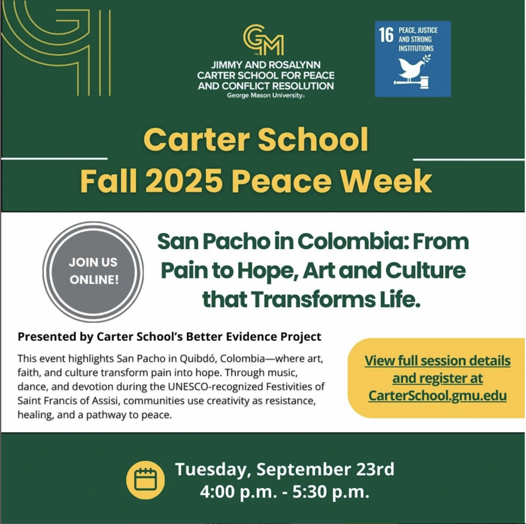 El próximo martes 23 de septiembre de 2025, de 3:00 PM a 4:30 PM (COT), se realizará el evento virtual “San Pacho en Colombia: Del dolor a la esperanza, arte y cultura que transforma vida”, una iniciativa presentada por el Proyecto Better Evidence (BEP) de la Escuela Carter para la Paz y Resolución de Conflictos.